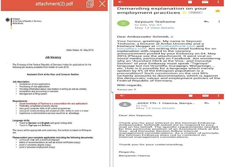 ከሦስት አመት በፊት በአዲስ አበባ የሚገኘው የጀርመን ኢምባሲ ባወጣው ክፍት የሥራ ማስታወቂያ ላይ ከጀርመንኛ፥ እንግሊዘኛ እና አማርኛ በተለየ የትግሪኛ ቋንቋ ለብቻው ቅድመ ሁኔታ ስለተደረገበት ምክንያት ማብራሪያ እንዲሰጡኝ ለአምባሳደሩ ደብዳቤ ፅፌ ነበር። የሥራ ማስታወቂያውን፣ የእኔን ደብዳቤና የኢምባሲውን ምላሽ ከታች ባለው ምስል ላይ መመልከት ይቻላል።