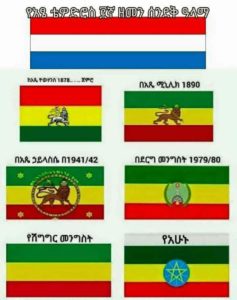 ፬) የደርግ መንግስት ባንዲራ ፦ ኣረንጓዴ፣ ቢጫ፣ ቀይ ሆኖ በመሃል በዘምባባ የተከበበ፣ ከላይ ቀይ ኮከብ ያለበት፣ ሰማያዊ ጮራ ያለበትና የመንኮራኮር ያለበት ነበር።