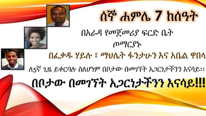 በነገው ዕለት የዞን ዘጠኝ ጦማሪዎች ማኅሌት ፋንታሁን፣ አቤል ዋበላ እና በፍቃዱ ኃይሉ በአራዳ የመጀመሪያ ፍርድ ቤት ይቀርባሉ።በነገው ዕለት ከሚቀርቡት ሶስቱ ጦማሪዎች ውስጥ ኣንዱ የሆነው ጦማሪ በፈቃዱ ሃይሉ (ፎቶ) በፖሊስ ለተቀነባበረው ባለ30 ገጽ የውሸት ዶክመንት ላይ እንዲፈርም 17 ቀናት በጨለማ ቤት ውስጥ ቆይቶ ነበር። ቶርቸርም ተደርጎኣል።ባለፈው ጊዜ ለይስሙላው ፍርድ ቤት በፖሊሶች ተጽዕኖ እየተደረገበት መሆኑን ባገኛት ደቂቃ በኣንደበቱ መተንፈሱም ኣይዘነጋም።