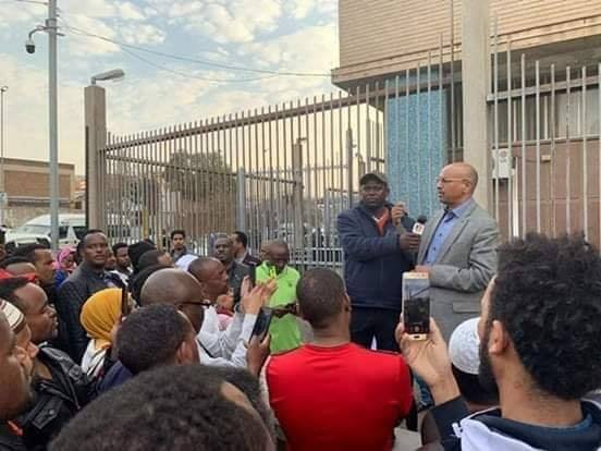 ተከታዩ ፎቶ አምባሳደሩ ከደቡብ አፍሪካ የሚመለከታቸው ባለ ሥልጣናት ጋር ተነጋግረው ሲወጡ ለሚጠብቁዋቸው ወገኖቻችን ማብራሪያ በሰጡበት ወቅት ነው።