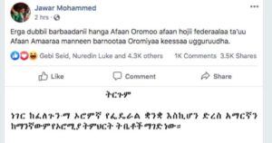 ከማኅበራዊ ሜዲያና ከብዙሐን መገናኛዎች እየራቅሁ ነው ያለውን ጃዋር መሐመድ ከአማራ ጋር የሚገናኝ ጉዳይ የተነሳ ሲመስለው ከራቀበት የማኅበራዊ ሜዲያና ከብዙሐን መገናኛዎች ከሁሉም በፊት ቀርቦ በመገኘት አስተያየትና ትንተና የሚሰጠው የአባቱ ቤት ማለትም የኦነግ ቤት ፖለቲካ