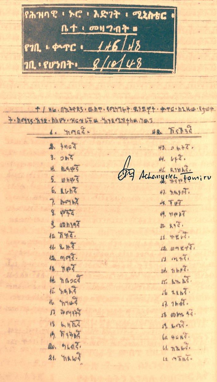 < ከታች የታተመው በሚኒስትሩ በጄኔራል ሙሉጌታ ቡሊ ይመራ የነበረው የሕዝባዊ ኑሮ እድገት ሚኒስቴር በ1948 ዓ.ም. በሚኒስትር መስሪያ ቤቱ የጥናት መጽሔት ላይ ያሳተመው የኢትዮጵያ ቋንቋዎች ዝርዝር እንደሚያሳየው በወቅቱ ማለትም በ1948 ዓ.ም. በኢትዮጵያ 80 ቋንቋዎች ይነገሩ እንደነበር ከነ ቋንቋዎቹ ስም ዘርዝሯል።[ከታች የታተሙትን ዶሴዎች ይመለከቷል]
