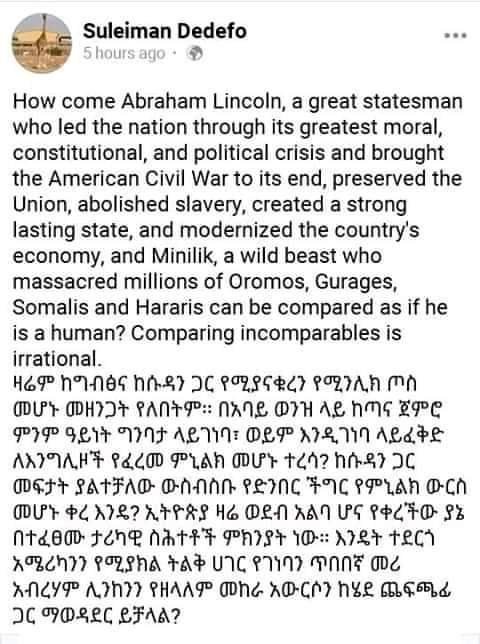 የሮበርት ኢ.ሊ. ሐውልት ይፍረስ መባሉን ተከትሎ  የዳግማዊ ዐፄ ምኒልክ ሐውልትም እንዲፈርስ ኦነጋውያን ለጀመሩት የጥላቻ ዘመቻ “የሮበርት ኢ.ሊ. ሐውልት ሲፈርስ ኢትዮጵያ ውስጥ ሐውልት መፍረስ ካለበት ከአንድ ሚሊዮን በላይ ባሮች የተፈነገሉበት የአባ ጅፋር ቤተ መንግሥት ነው!” በሚል ርዕስ የጻፍሁትን መልስ ያነበበው ሱሌማን ደደፎም  በሁላችን ስም አምባሳደር መሆኑ ሳያስጨንቀው ኦነጋውያን የከፈቱትን የጥላቻ ዘመቻ በይፋ  የተቀላቀለው “ድመት መንኩሳ አመሏን አትረሳ” እንዲሉ የጥላቻ ብሔርተኛ ስለሆነ  የተሸለመው ኃላፊነት  ከጎለመሰበት የጥላቻ ፖለቲካ ስለማይበልጥበት ነው።