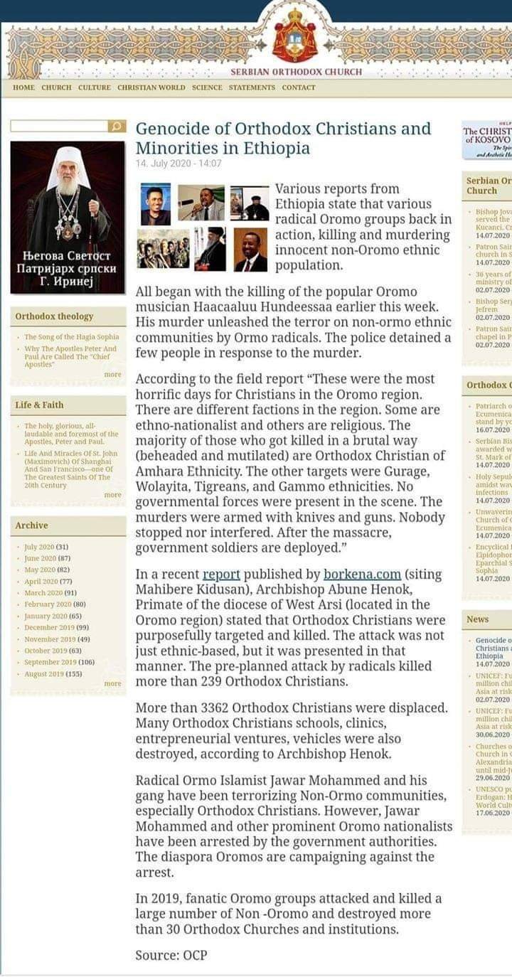 የሰርቢያ ኦርቶዶክሳዊት ቤተ ክርስቲያን እ.ኤ.አ ባሳለፍነው ጁላይ 14 ቀን 2020 ዓ.ም በይፋዊ ድረ ገጿ ላይ ባወጣችው ዘገባ በኢትዮጵያ ኦርቶዶክስ ተዋህዶ ቤተ ክርስቲያን ተከታዮች ላይ የዘር ማጥፋት ወንጀል ተፈፅሟል በማለት ኢትዮጵያውያን ወገኖቻችን እንኳ የካዱትን የኦርቶዶክሳውያንን መገፋት ፣ መጨፍጨፍ እና የማጥፋት ዘመቻ የሩቋ ሰርቢያ ኦርቶዶክሳውያን ለዓለም አቀፉ ማኅበረሰብ ድምፅ ሆነውልን ተስተውለዋል።