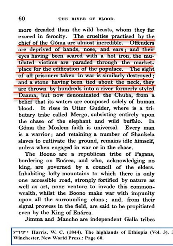 “The cruelties practiced by the chief of the Góma are almost incredible. Offenders are deprived of hands, nose, and ears; and their eyes having been seared with a hot iron, the mutilated victims are paraded through the market place for the edification of the populace. The sight of all prisoners taken in war is similarly destroyed; and a stone having been tied about the neck, they are thrown by hundreds into a river formerly styled Daama”
