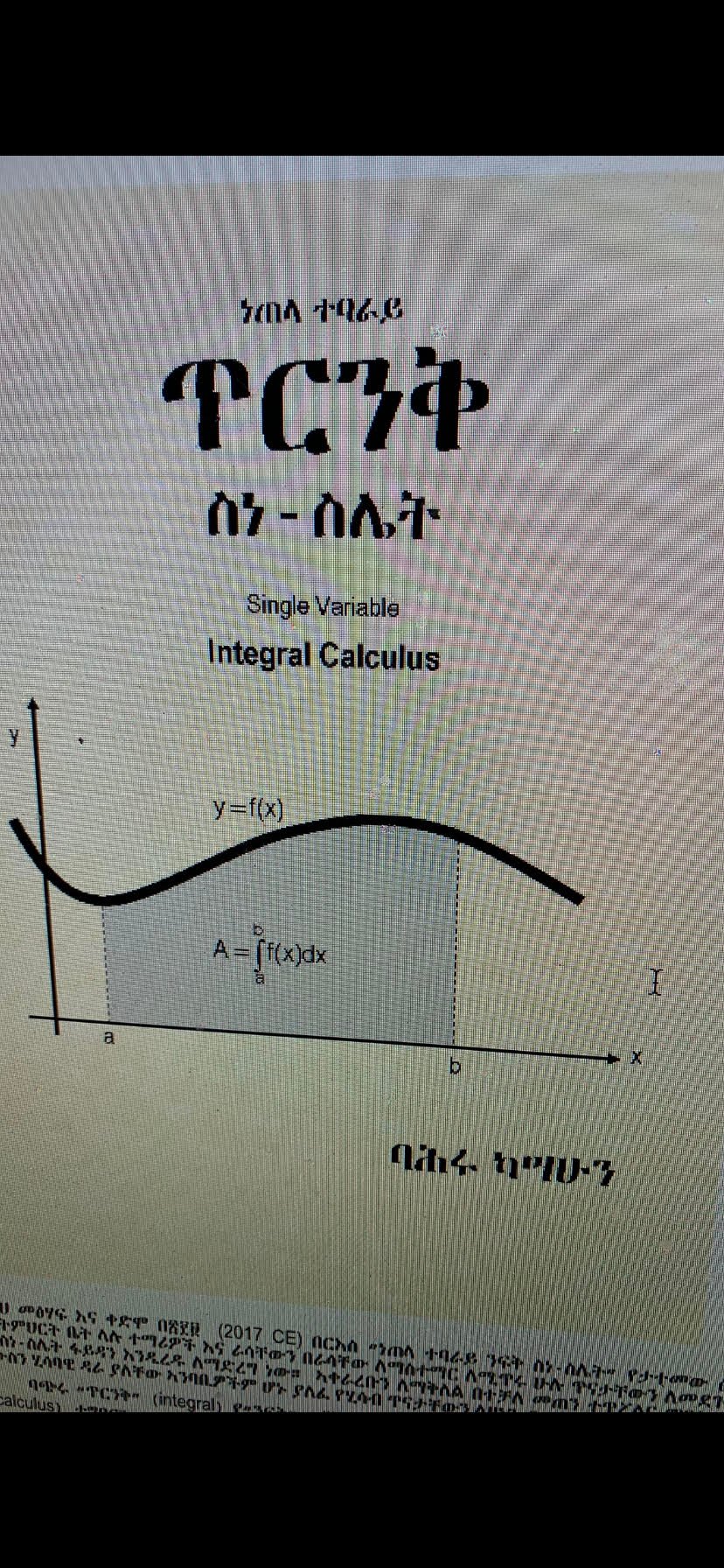 መፅሃፍ (Book in Amharic entitled “ነጠላ ተባራይ ጥርንቅ ስነ-ስሌት”)… (Single Variable Integral Calculus).
