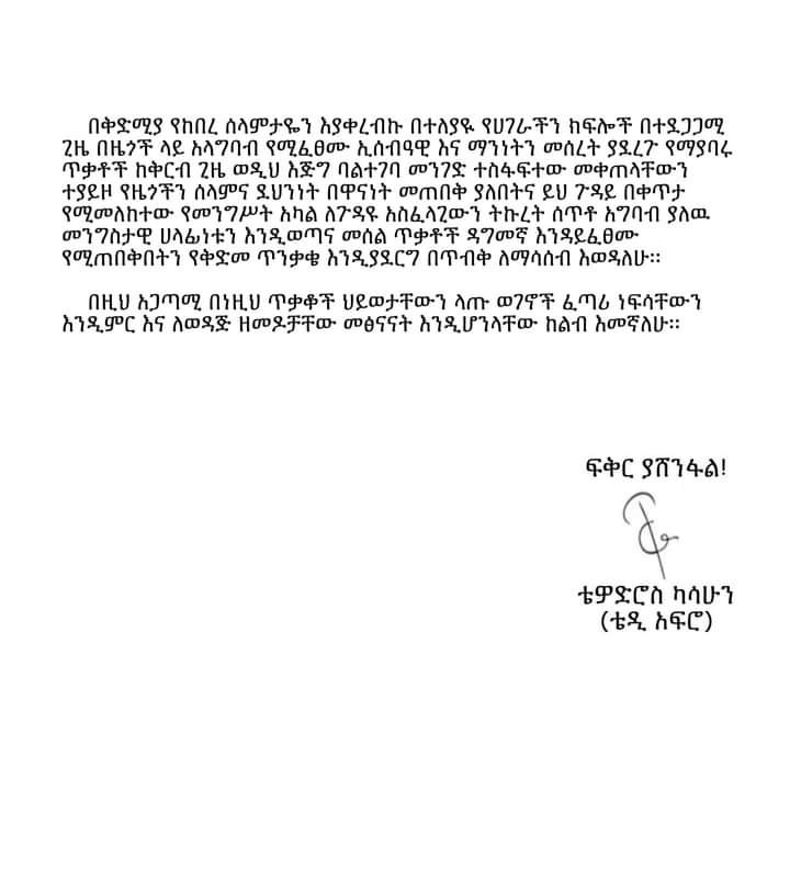 በቅድሚያ የከበረ ሰላምታዬን እያቀረብኩ በተለያዪ የሀገራችን ክፍሎች በተደጋጋሚ ጊዜ በዜጎች ላይ አላግባብ የሚፈፀሙ ኢሰብዓዊ እና ማንነትን መሰረት ያደረጉ የማያባሩ ጥቃቶች ከቅርብ ጊዜ ወዲህ እጅግ ባልተገባ መንገድ ተስፋፍተው መቀጠላቸውን ተያይዞ የዜጎችን ሰላምና ደህንነት በዋናነት መጠበቅ ያለበትና ይህ ጉዳይ በቀጥታ የሚመለከተው የመንግሥት አካል ለጉዳዩ አስፈላጊውን ትኩረት ሰጥቶ አግባብ ያለዉ መንግስታዊ ሀላፊነቱን እንዲወጣና መሰል ጥቃቶች ዳግመኛ እንዳይፈፀሙ የሚጠበቅበትን የቅድመ ጥንቃቄ እንዲያደርግ በጥብቅ ለማሳሰብ እወዳለሁ።