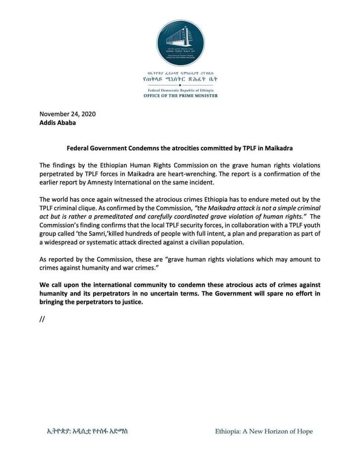 ጠቅላይ ሚኒስትር አብይ ትንሽ ግራ መጋባት ወይም የተሳሳተ የህግ ምክር ሳይቀርብላቸው አልቀረም። ከዚህ በታች በተያያዙት እና በተከታታይ ቀናት በወጡት ሁለት ደብዳቤዎች እጅግ የሚቃረኑ ሃሳቦችን አንጸባርቀዋል። በማይካድራ የተፈጸመውን ሰቆቃ በተመለከተ ጉዳዩ crimes against humanity ስለሆነ የአለም አቀፉ ማህበረሰብ ጣልቃ ገብቶ ድርጊቱን እንዲያወግዝ እና አጥፊዎቹን ለፍርድ ለማቅረብ እንዲተባበር ይጠይቃሉ።