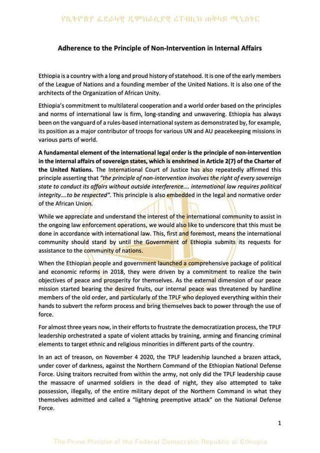 በዛሬው ደብዳቤያቸው ደግሞ በትግራይ ያለው ግጭት ሕግ የማስከበር ጉዳይ ስለሆነ አለም አቀፉ ማህበረሰብ እጁን ይሰብስብ፣ በውስጥ ጉዳያችንም አይግባ፣ ማናቸውም አይነት ጣልቃ ገብነት የአገሪቱን ሉዓላዊነት የሚዳፈር ስለሆነ በተባበሩት መንግስታት ቻርተር አንቀጽ 2(7) ላይ የተደነገገውን በአገሮች የውስጥ ጉዳይ ጣልቃ ያለመግባት መርህን የጣሰ ነው የሚል ሙግት አንስተዋል።