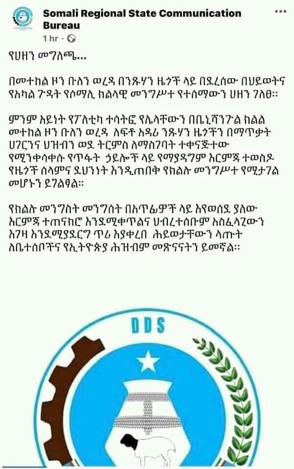 የፌደራል መንግሥቱ “ክልሎች የኀዘን መግለጫ ማውጣት አይችሉም” ብሎ ባልተፃፈ ደብዳቤ ቢከለክልም በአቶ ሙስጠፌ የሚመራው የሶማሌ ክልል ግን ይሄን ትዕዛዝ አሽቀንጥሮ በመተከሉ እልቂት ዙሪያ የተሰማውን ኀዘን የገለጸ ብቸኛ ክልል ሆኗል።