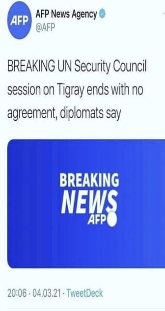 በመሆኑም ሩሲያ፣ህንድና ቻይና የትግራይ ጉዳይ የኢትዮጵያ የውስጥ ጉዳይ ነው ስላሉ ያለምንም ውሳኔ የተባበሩት የፀጥታው ምክር ቤት ስብሰባ ብትንትኑ ወጥቷል፤