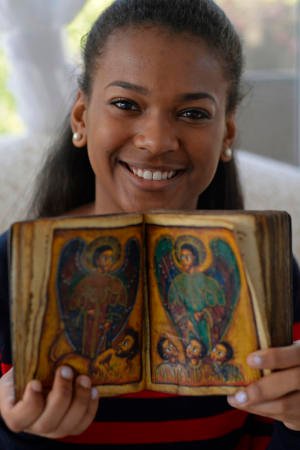 Nubia Wilson, 16, of Antioch, holds a 17th century Ethiopian Orthodox manuscript at her home in Antioch, Calif., on Sunday, Jan. 11, 2015. (Jose Carlos