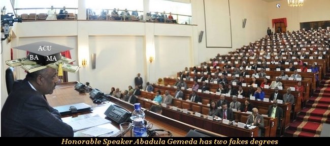 ”Honorable” Abadula Gemeda, who is the chief “lawmaker” in Ethiopia as speaker of the lower house, bought Bachelor of Arts and Masters “degrees” in public administration in 2001 and 2004 respectively from American Century “University”.