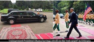 From the moment the U.S. President landed at Bole International Airport to his departure, there were disorganized roadshows that revealed a tyrannical clique running around like a headless chicken. While making the U.S. President stroll around on shabby doormats and rugs rolled out as “red carpets” may seem a side issue, it drew ridicule globally even from bloggers in Kenya, where he was accorded a stately and colorful welcome. But for the TPLF goons what mattered the most was the photo opportunity and the cheap propaganda.Obama and the circus of clowns in Ethiopia