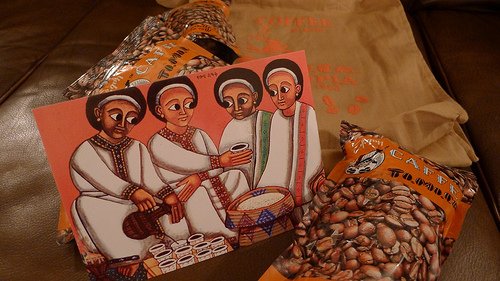 I was going to write a “Crafts in Ethiopia” blog entry like my Crafts in Rwanda entry from February. Then I realized that in Ethiopia there is heavy overlap between art, craft, and religious icons. Some of the works I brought home are between these categories. For example, if the two paintings on goat skin above were not religious in content, I would consider them crafts; however, because one is depicts Saint George and the other represents the Holy Trinity, and both are heavily inspired in design by ancient icons still in active church use, I am not sure into what category they fall.