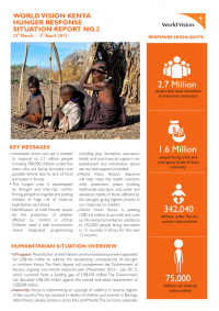 • World Vision has so far received 59% of the 21 million US dollars requested for hunger crisis. Further funding is required to continue meeting the needs of 716,000 people targeted for humanitarian assistance.
