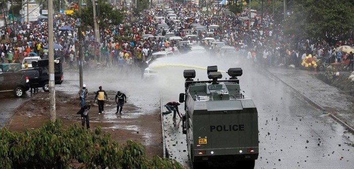 Police fired tear gas at the convoy in which Odinga was traveling and used water cannon as they tried to stop it reaching the capital’s main business district.